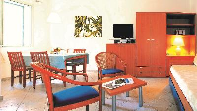 ZimmerAls Unterkunft dienen 144 geräumige Appartments, die für bis zu vier Personen Platz bieten (57m²), aufgeteilt auf 36 Gebäude mit zwei Etagen und je vier Wohnungen. Sie verfügen über Bad/WC, Küche, Schlafraum mit zwei Einzelbetten, Wohnraum mit Sofabetten sowie Balkon oder Terrasse. Zur Ausstattung gehören Klimaanlage, SAT-TV, Telefon, Safe, Minibar und Haartrockner.